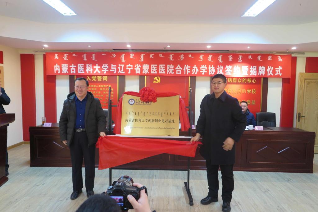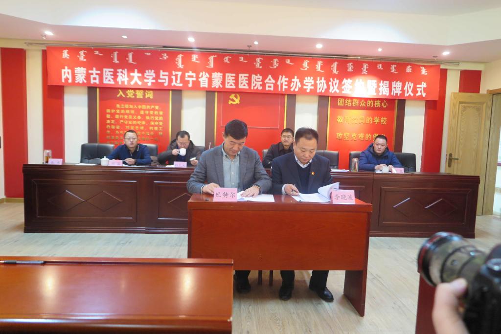 巴特尔与李晓波签订合作办学协议。陈英松与韩天元共同为创新创业见习基地揭牌。巴特尔与李晓波共同为内蒙古医科大学蒙医教学医院揭牌。
